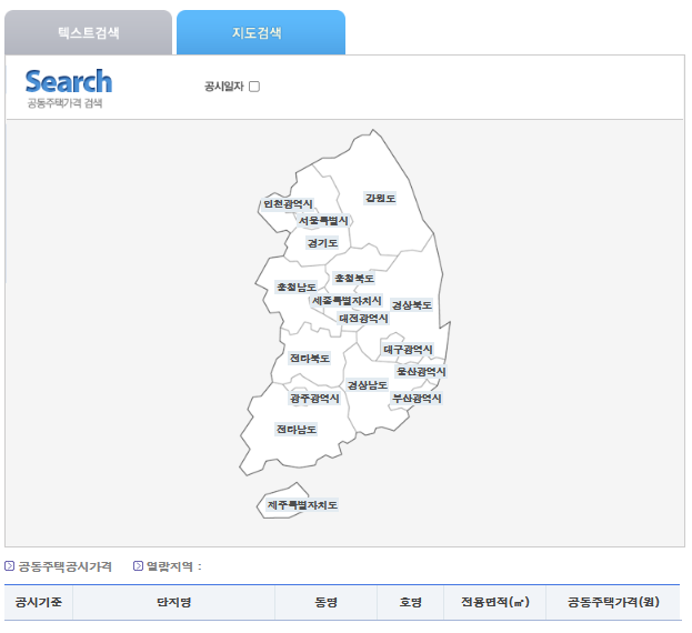 지도 검색은 아래 사진과 같이 지도에서 지역을 선택할 수 있습니다. 원하는 '도'를 선택하고, 세부 지역을 선택합니다. 지역을 모두 선정하면 '단지명' 혹은 '지번'을 입력하여 검색할 수 있습니다.
