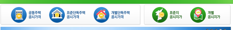 홈페이지에서는 여러 기능을 카테고리로 나눠뒀습니다. '공동주택 공시가격' , '표준단독주택 공시가격', '개별단독주택 공시가격', '표준지 공시지가', '개별 공시지가'의 메뉴 카테고리가 메인화면에 있습니다.