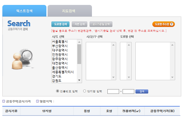 아파트 공시지가를 확인하기 위해서 가장 첫번째에 있는 '공동주택 공시가격' 기능을 선택합니다. 제공하는 검색 방법으로 '텍스트 검색', '지도검색'이 있습니다. 텍스트 검색은 주소를 이용해 검색을 하는 것이며, 대상 물건의 주소를 알아야 합니다. 도로명 검색, 지번 검색, 공시기준일 검색의 세부 항목이 있습니다.