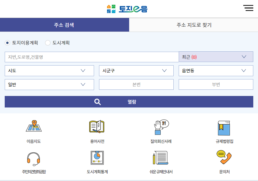 토지이음 사이트에 접속하면 다양한 메뉴를 볼 수 있습니다. 기본적으로 '주소 검색'과 '주소 지도로 찾기'의 기능을 처음에 선택하게 됩니다. 다음으로 구체적인 내용을 입력하여 검색할 수 있습니다.