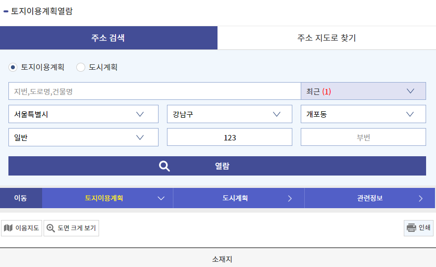 사용 방법을 살펴보기 위해 임의의 상황을 가정하여 진행하겠습니다. '주소 검색'을 이용하게 됩니다. 토지이용계획, 도시계획 중 택1하여 댕상 물건의 상세 주소를 입력한 후 열람을 할 수 있습니다. (다음 예시는 임의로 지정한 주소로 열람을 시행한 결과입니다. )